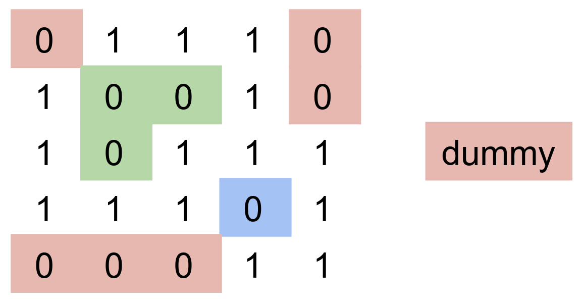Na početku algoritma, svaki element matrice postaje jedinični skup. Pri tome, dodajemo još jedan jedinični skup koji će sadržati dummy element. Prolaskom kroz matricu za svaku poziciju \((i, j)\) proverimo da li se na njoj nalazi nula. Ukoliko je to slučaj, proveravamo da li je pozicija \((i, j)\) pripada prvoj ili poslednjoj koloni, odnosno prvoj ili poslednjoj vrsti. Ukoliko pozicija \((i, j)\) pripada prvoj ili poslednjoj koloni, odnosno prvoj ili poslednjoj vrsti, onda vršimo uniju skupa kome pripada element na poziciji \((i, j)\) sa skupom kome pripada dummy element. Inače, vršimo uniju skupa kome pripada element na poziciji \((i, j)\) sa skupovima kojima pripadaju elementi na pozicijama \((i-1, j)\), \((i+1, j)\), \((i, j-1)\), i \((i, j+1)\) samo ako se na njima nalazi nula i ne pripadaju prvoj ili poslednjoj koloni, odnosno prvoj ili poslednjoj vrsti.